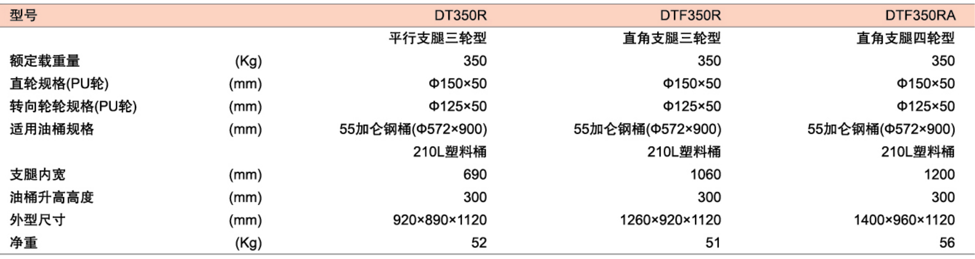 ● DT为平行支腿设计,DTF为直角型支腿设计,适合搬运托盘上的油桶